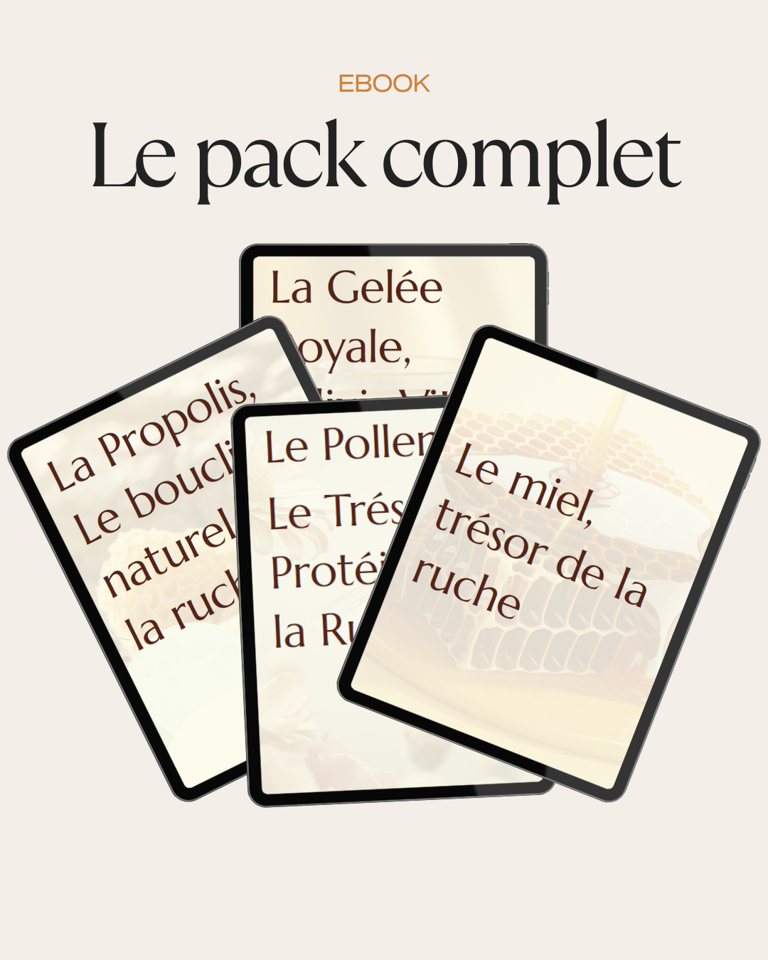 Découvrez le pack complet des quatre e-books dédiés aux trésors de la ruche : miel, propolis, gelée royale et pollen.